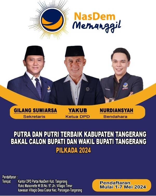 “Hari ini tanggal 7 Mei 2024 penjaringan bakal calon kepala daerah dan wakil kepala daerah untuk Pilkada Kabupaten Tangerang dari Partai Nasdem resmi ditutup. Selanjutnya kami akan melaksanakan pleno untuk membahas usulan bakal calon dari Partai Nasdem,” kata Yakub.